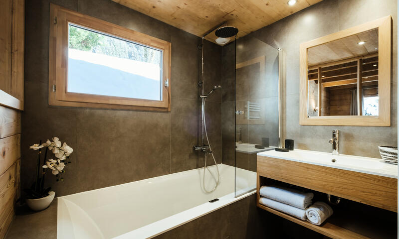 - CHAMBRE (9.43 m²) : 1 LIT 2 PLACES (160), fenêtre nord, vue chalets voisins / espaces verts, salle d'eau attenante (3.75 m²) : baignoire, vasque, radiateur SECHE-SERVIETTES, fenêtre haute est