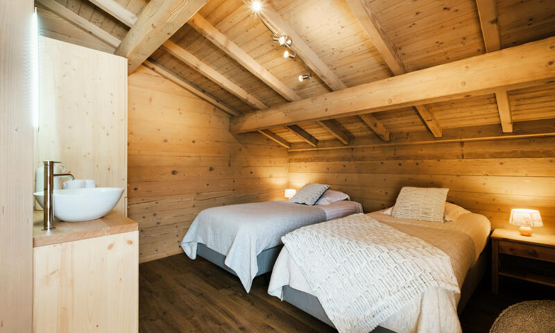 - CHAMBRE (12.45 m² dont 2.62m² mansardés) : 2 LITS 1 PLACE (90), vasque, porte-fenêtre, balcon ouest, vue chalets voisins / montagne