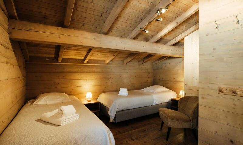 - CHAMBRE (14.84 m² dont 5.32m² mansardés) : 2 LITS 1 PLACE (90), fenêtre est, vue chalets voisins / espaces verts