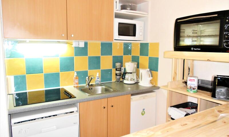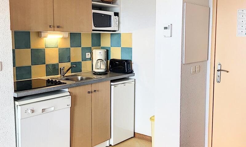 La pièce à vivre est équipée d'un canapé gigogne en 80X190 pour 1 personne, TV grand écran, balcon plein sud, et d'un coin cuisine avec frigo top, 4 plaques vitro céramiques, micro ondes combiné grill, lave vaisselle, cafetière filtre + Tassimo, appareil à raclette, grille pain et bouilloire.