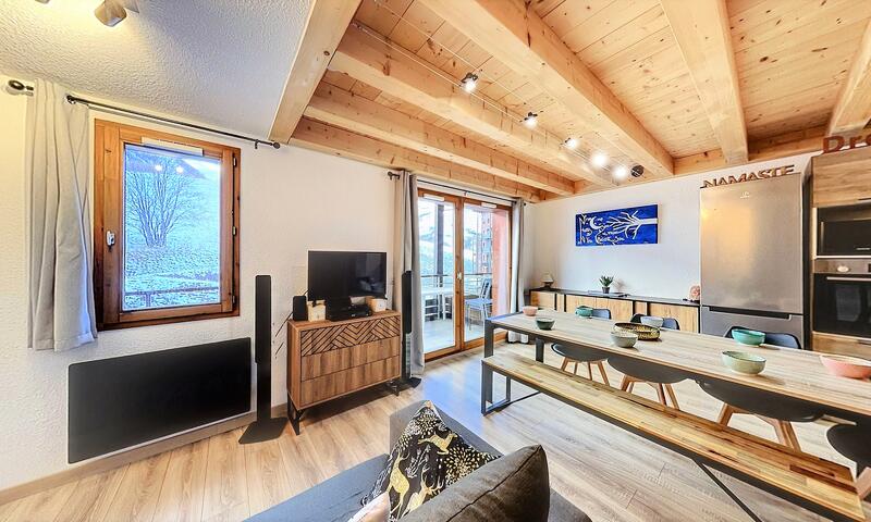 La pièce à vivre est équipée d'un canapé gigogne pour 2 personnes, TV grand écran, table pouvant accueillir 6 convives, balcon, et d'un coin cuisine avec 4 vitro céramique, four micro-ondes combiné, réfrigérateur top, lave vaisselle, cafetière Nespresso, grille-pain, bouilloire et appareil à raclette.