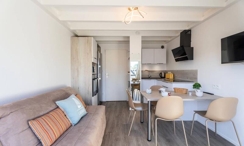 - Séjour avec partie repas (table et chaises) et partie salon (TV, canapé BZ : couchage 2 personnes, 140, couverture) donnant sur la terrasse exposée Sud (mobilier de jardin)