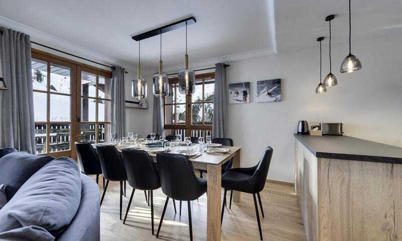 Appartement 3016 dans la résidence Prince des Cimes, au coeur du village piéton Arc 1950, de 110m² offre un grand salon séjour sur un espace repas, 3 chambres doubles et une chambre avec 2 lits superposés pouvant accueillir 10 personnes.