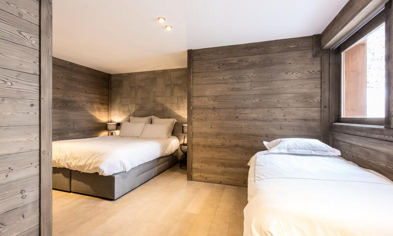 Au dernier niveau : Une chambre tribu spacieuse, aménagée avec quatre lits simples (90 cm), offre une vue sur le toit du chalet et sur la montagne.