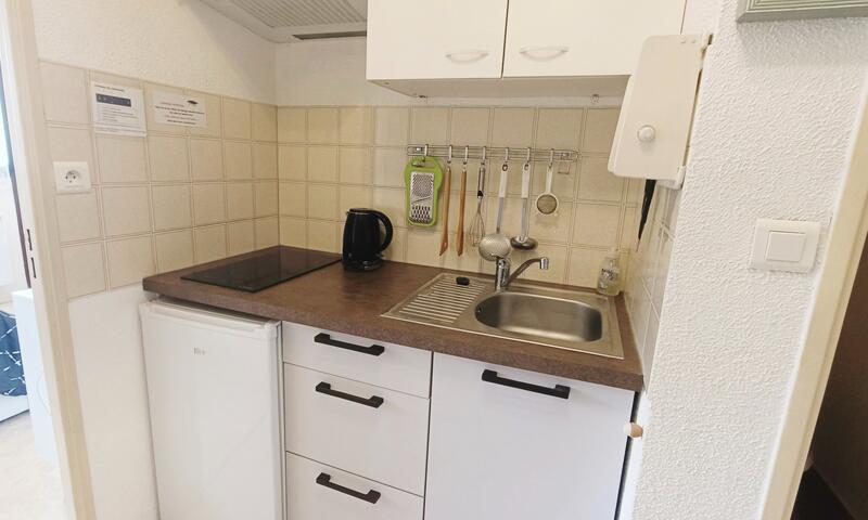 Cuisinette ouvrant sur entrée (pvc) : 2 pl électriques, évier, réfrigérateur, mini four,micro-ondes, cafetière électrique, bouilloire, grille pain, vaisselle et batterie de cuisine.