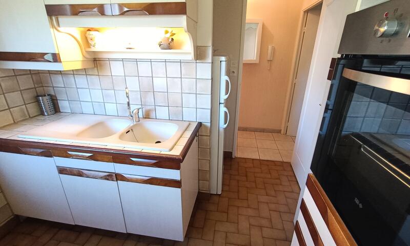 Cuisine intégrée (sol carrelage) : réfrig/congélateur, 3 plaques vitro, évier, four électrique, 1 hotte,  micro ondes, cafetière électrique, 1 bouilloire, 1 grille pain, vaisselle et batterie de cuisine