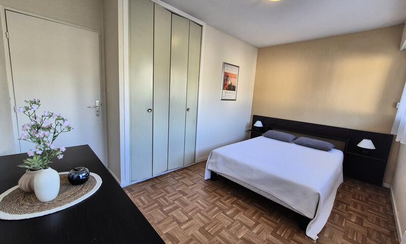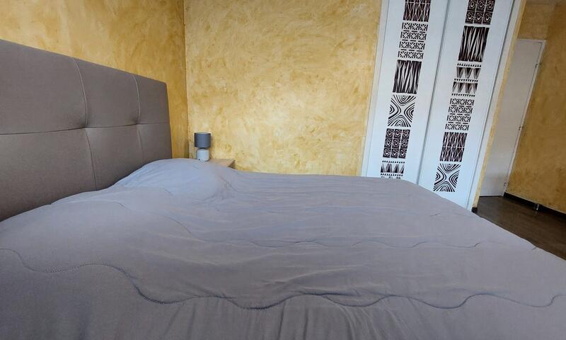 Chambre (sol pvc) avec fenêtre Est : 1 lit 140 cm,  chevets intégrés, 1 commode, 1 armoire penderie murale