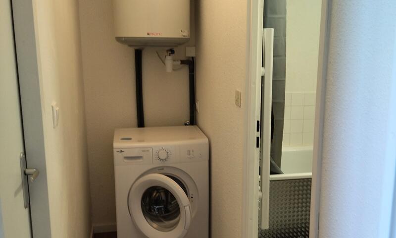 Salle de bain avec douche, lavabo, lave-linge, sèche-serviette et WC. Ce bien est équipé d'une cafetère à filtre et d'un appareil à raclette.
