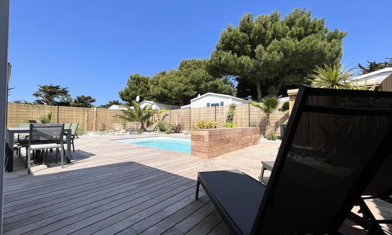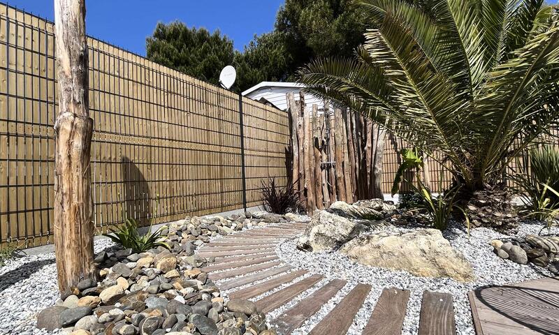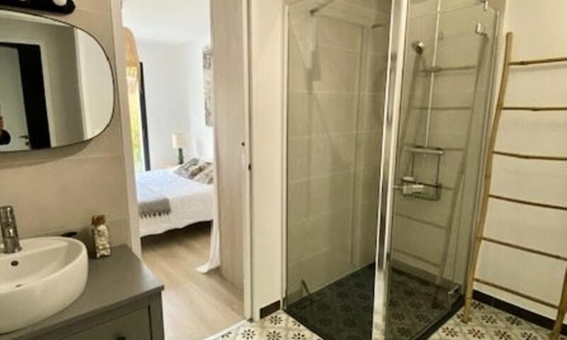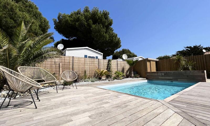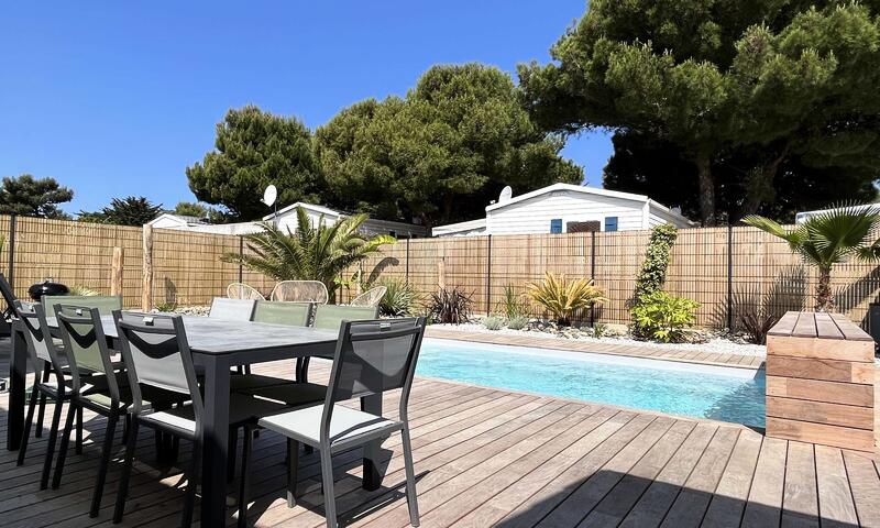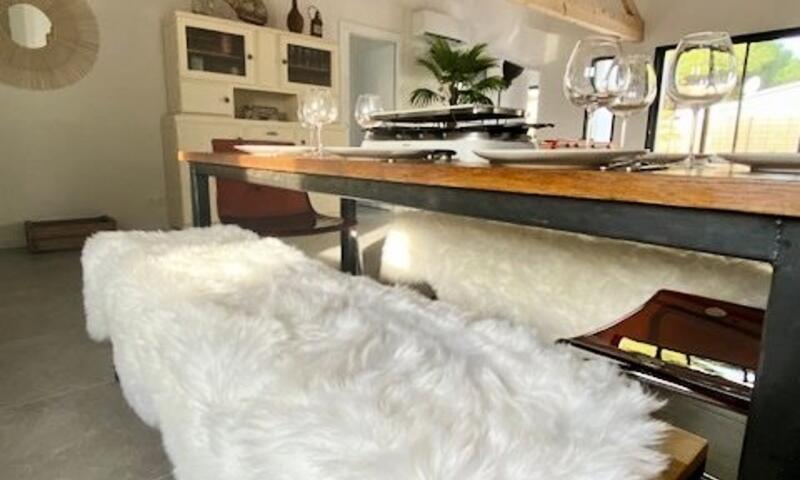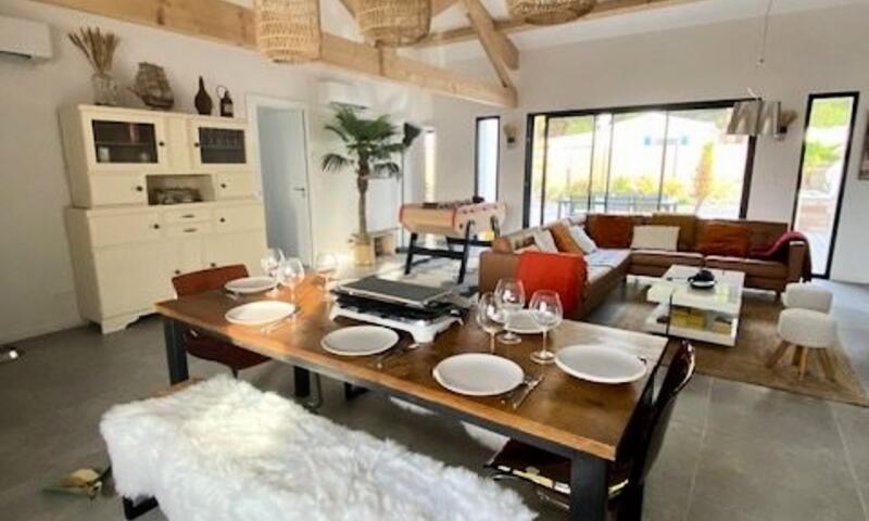 Belle maison contemporaine avec charpente apparente sur un terrain de 500 m² environ avec piscine privée se composant d'une grande pièce de vie avec cuisine ouverte aménagée et équipée, d'une première chambre avec un lit deux couchages (160) et rangements, d'une deuxième chambre avec un lit deux couchages (140), un lit un couchage (90) et rangements, ces deux chambres possèdent une salle d'eau attenante ainsi qu'un WC indépendant, d'une troisième chambre avec un lit deux couchages (160) et rangements, d'un quatrième chambre avec un lit deux couchages (140), un lit un couchage (90) et rangements, ces deux chambres possèdent également une salle d'eau attenante ainsi qu'un WC indépendant, d'un cellier avec rangements. A l'extérieur, une terrasse donnant sur une piscine privée (ouverte et chauffée de mi-juin à mi-septembre) à l'abri des regards ainsi qu'une douche extérieure. Parking sur le terrain.