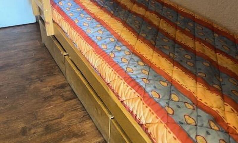 Séjour: lino au sol, télévision, banquette gigogne (convertible en deux lits simples côte à côte).