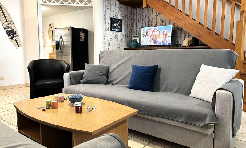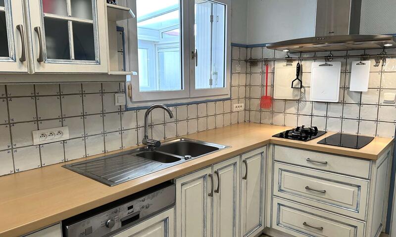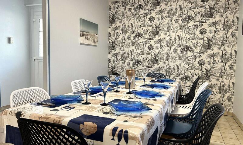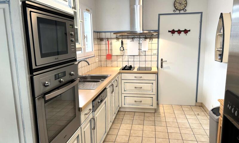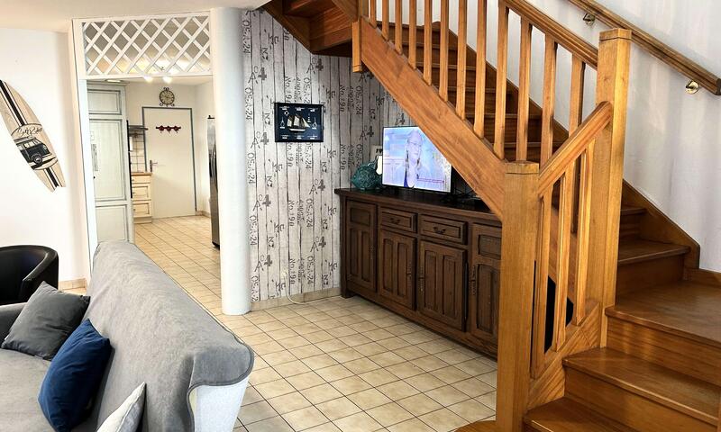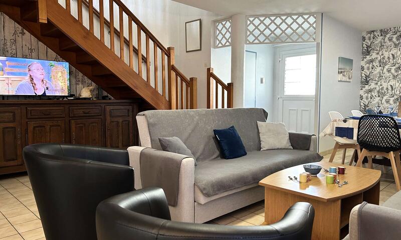 Cette maison de vacances comprend au rez de chaussée : une cuisine équipée avec plaque 2 feux induction et 2 feux  gaz , lave- vaisselle, réfrigérateur/ congélateur, four,micro-ondes. Un séjour avec télévision et accès internet, deux canapés, un WC. Un garage accessible au voiture, un cellier avec lave-linge, sèche linge et une véranda avec salon de jardin et barbecue. A l'étage: trois chambres totalisant deux lits doubles, un lit simple et deux lits simples superposés, une salle d'eau et un wc.