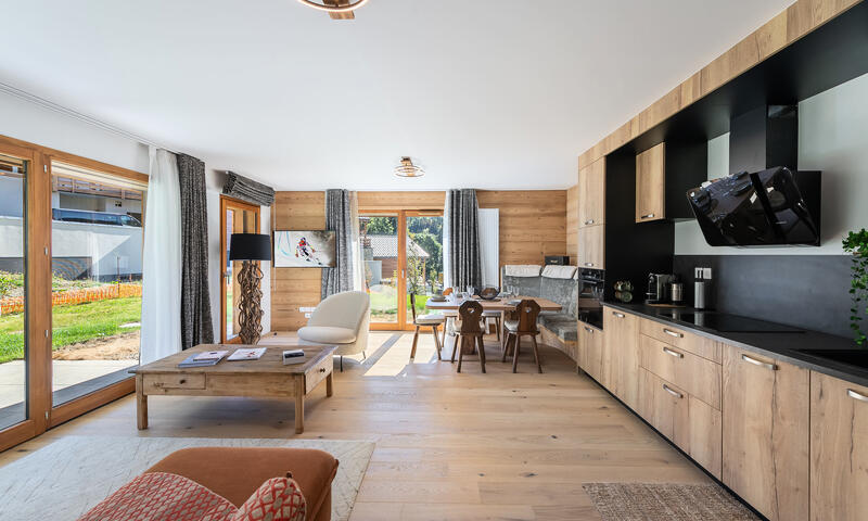 La pièce de vie lumineuse et conviviale comprend un coin TV connectée, idéal pour se détendre après une journée de découverte ou de ski. De plus, cette pièce s'ouvre sur une belle terrasse, parfaite pour profiter de l'air frais et du cadre verdoyant environnant.