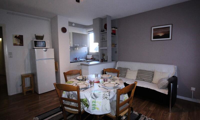 Cet appartement comprend une entrée, une salle d'eau avec douche, lave-linge et wc, une chambre exposé est avec un lit 140 et rangement, une autre chambre exposé est avec un clic clac en 140 et armoire penderie, un séjour exposé sud donnant sur une loggia avec une belle vue sur la montagne. une kitchenette équipée ouverte sur le séjour (micro-ondes, four, réfrigérateur congélateur, plaques vitrocéramique, hotte aspirante). téléviseur et jeux de société. le sol est recouvert d'un parquet vitrifié.