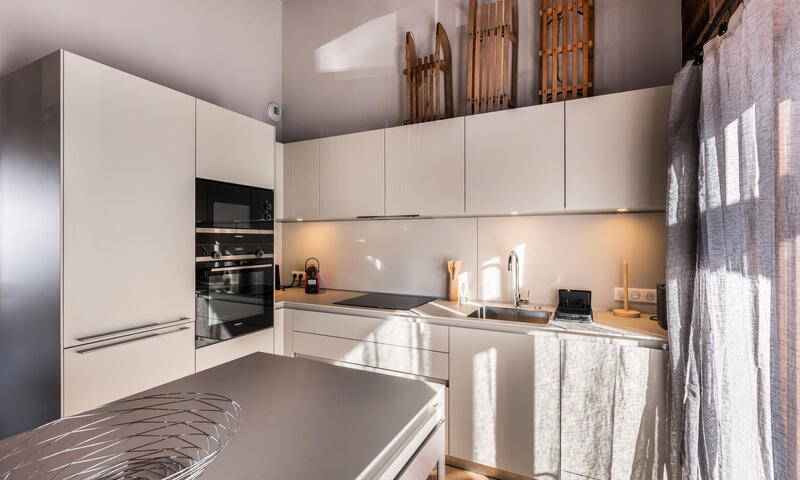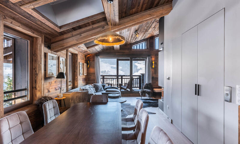 L'appartement Stallion F01 de 143 m² est sur 3 étages avec ascenseur, avec un décor moderne et montagne. Il accueille confortablement 9 personnes dans 3 chambres, dont une chambre enfants avec lits superposés. La pièce de vie traversante comprend cuisine équipée, espace repas, salon avec cheminée et accès terrasse avec vue montagne.