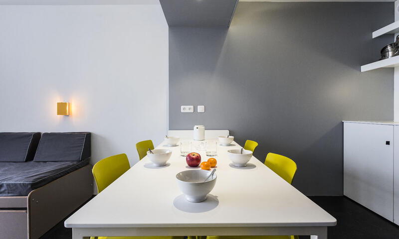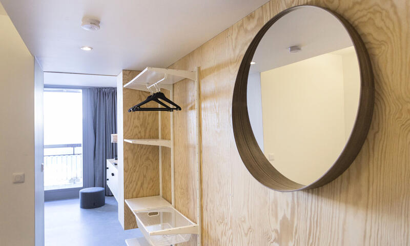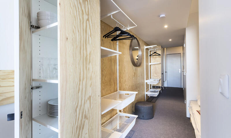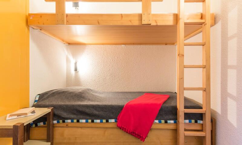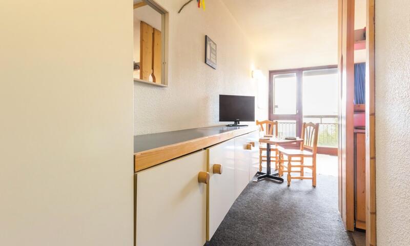 Studio cabine rénové et coloré d'une superficie de 29m² pour 5 personnes, situé au 10ème étage de la résidence Varet 3, balcon exposé Sud/Sud-Est avec vue sur la station et les pistes