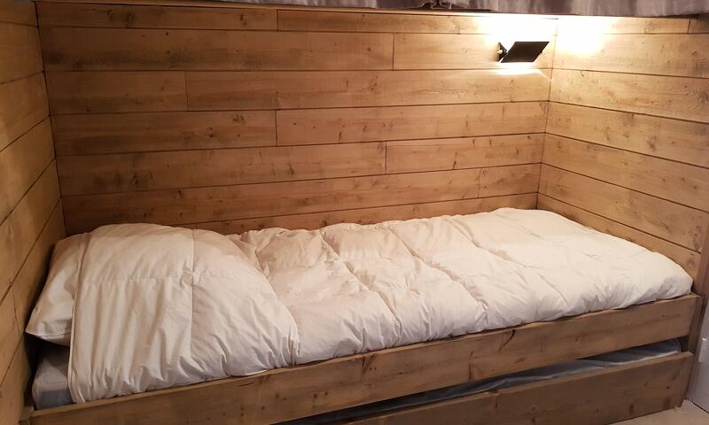 Un espace nuit est aménagé dans l'entrée et comprend un lit superposé et un lit tiroir pour une personne
