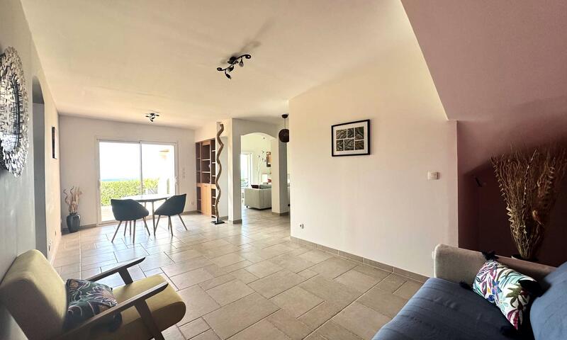 Niveau 1 : vaste séjour/salle à manger climatisé ouvrant sur terrasse vue mer, une cuisine équipée ouvrant  sur une terrasse couverte, une cuisine d'été et un coin repas , une buanderie avec lave-linge et sèche-linge, 1 chambre double avec 1 lit Queen Size (160*200) et salle d'eau , un WC indépendant,  1 suite parentale climatisée avec 1 lit Queen Size (160*200) et 1 belle salle de bains avec baignoire balnéo.