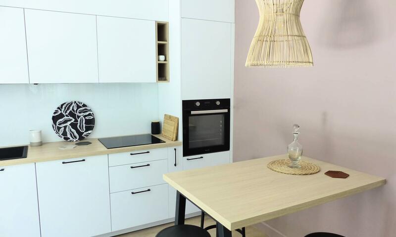 L'entrée mène à un séjour/salon spacieux (27 m2) qui s'ouvre sur une agréable terrasse. La cuisine indépendante est entièrement équipée avec un réfrigérateur-congélateur, un lave-vaisselle, un micro-ondes, un four électrique et une plaque vitrocéramique. Elle s'ouvre également sur la terrasse, équipée d'une table, de chaises pour déjeuner à l'extérieur et d'un barbecue.