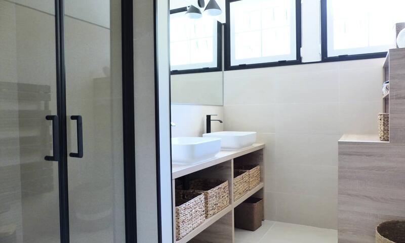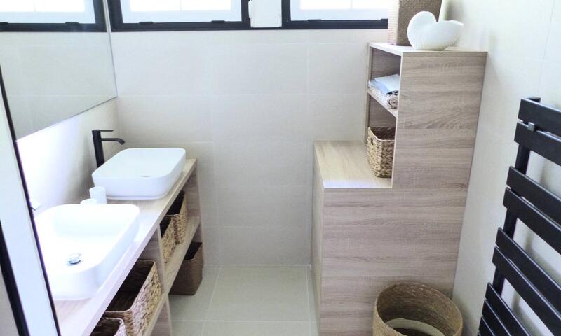 La salle de douche est équipée d'un double vasque, d'une douche et d'un lave-linge. Les WC sont séparés.