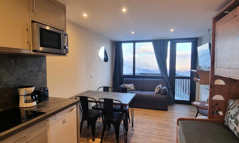 Ce studio rénové en 2019 se trouve au niveau "H" du Paquebot des Neiges et est accessible par l'ascenseur "Zénith". Il se compose d'une cuisine ouverte sur le séjour, d'une salle de bains et d'un WC indépendant. Son balcon exposé Sud offre une jolie vue sur les pistes.