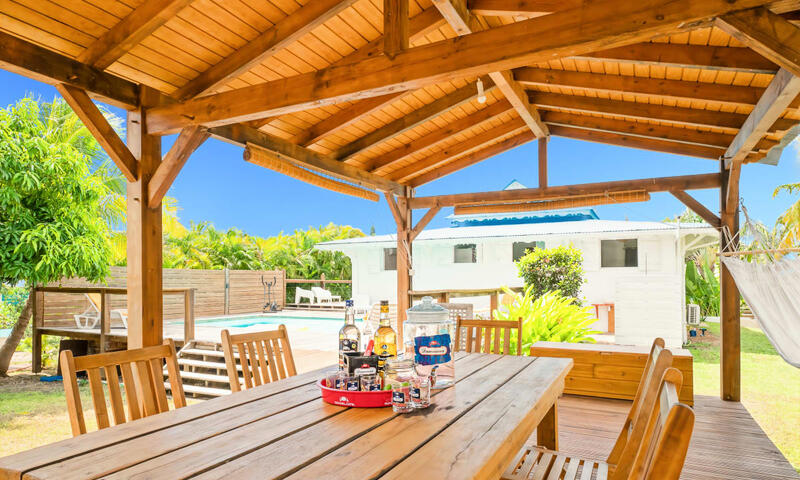 Un grand carbet avec sa cuisine d'été en bordure de piscine pour des brunchs, déjeuners et apéros en toute intimité au fond du jardin.