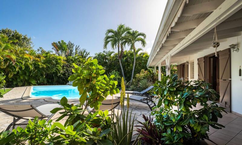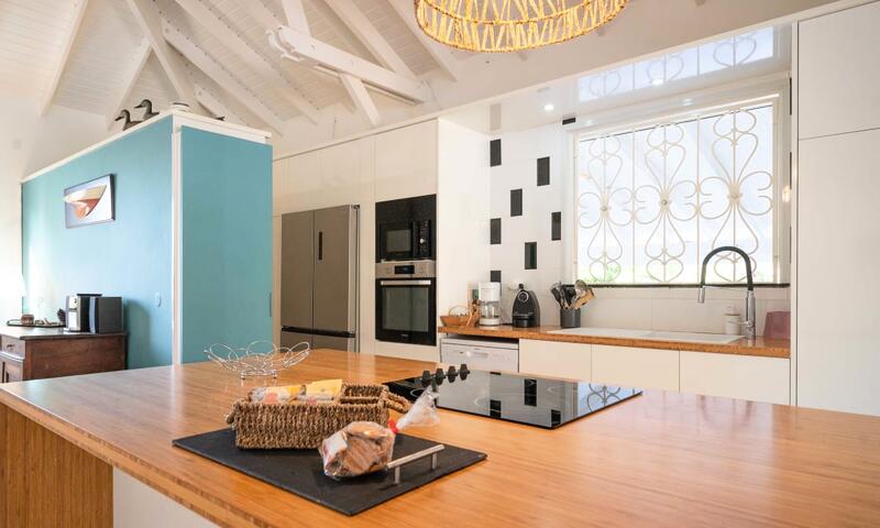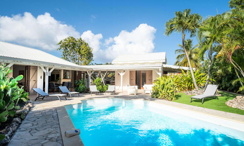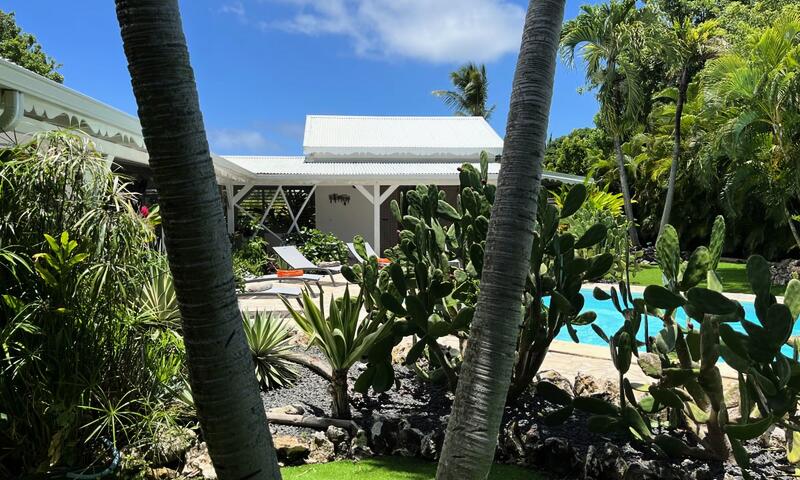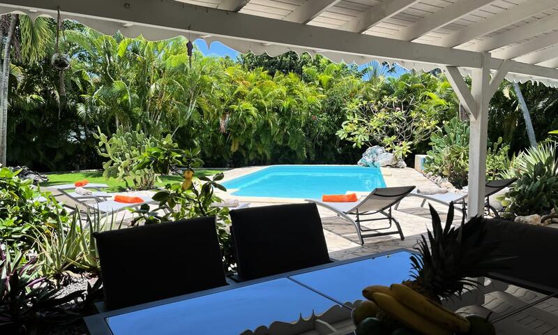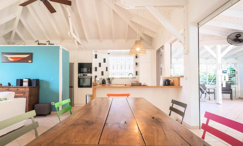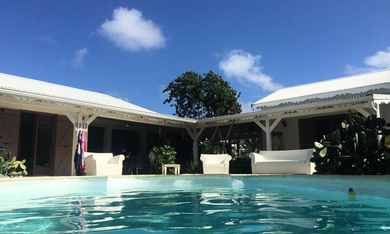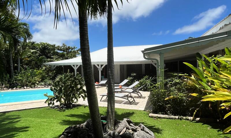 Intimiste à l'abri des regards, nichée au milieu d'un écrin de verdure en lotissement privé à moins de 3 km de toutes commodités et des plages, superbe villa avec piscine. Décoration mêlant douceur balnéaire et couleurs des caraibes.
