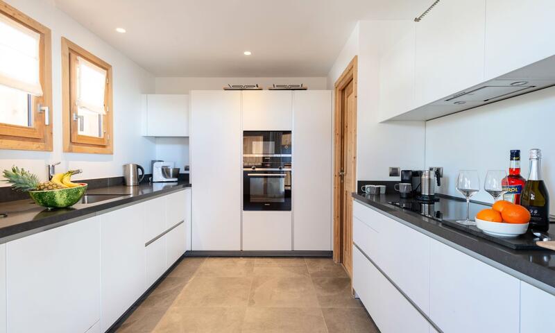 Cuisine ouverte équipée de plaques induction, lave-vaisselle, four, four micro-ondes, chauffe assiettes, cave à vin, bouilloire, grille-pain et cafetière électrique Nespresso.